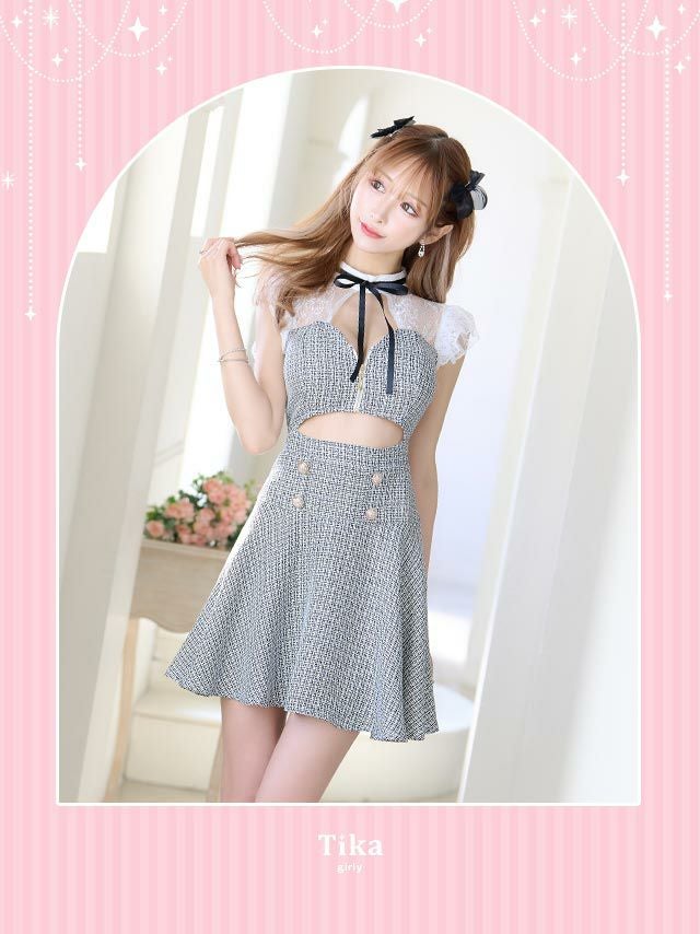 5. [SALE] ネックリボンノースリーブレース切り替えバストジップウエストカットツイード調フレアミニドレス (Sサイズ~XLサイズ) (浦西ひかる/キャバドレス着用)
