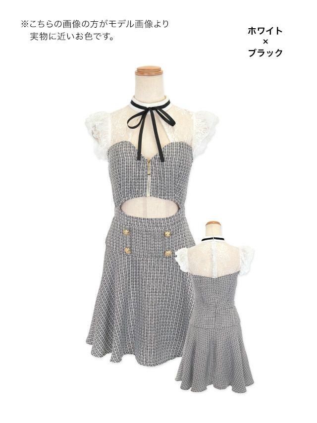 ネックリボンノースリーブレース切り替えバストジップウエストカットツイード調フレアミニドレスのカラーバリエーション