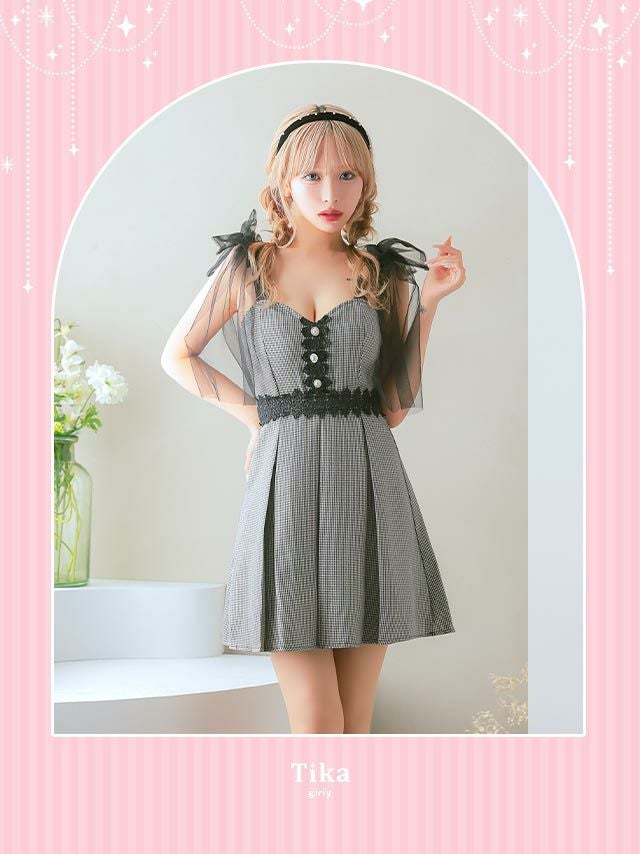 3. ショルダーチュール リボン キャミソール 刺繍 千鳥格子柄 ボックスプリーツ ガーリー フレアミニドレス (Sサイズ~Lサイズ) (重川茉弥/キャバドレス着用)