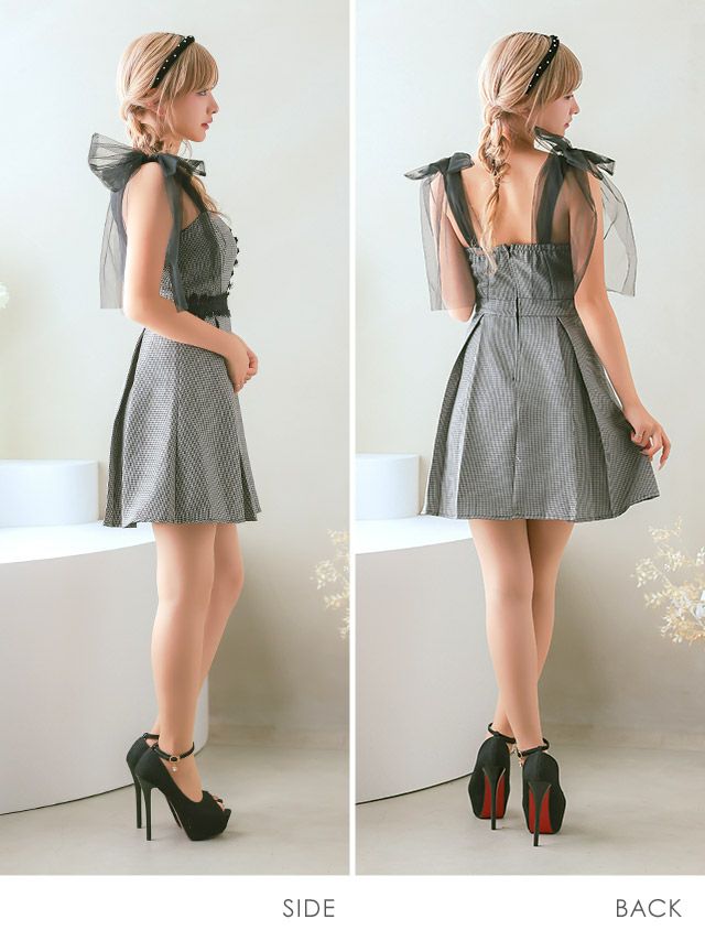 4. ショルダーチュール リボン キャミソール 刺繍 千鳥格子柄 ボックスプリーツ ガーリー フレアミニドレス (Sサイズ~Lサイズ) (重川茉弥/キャバドレス着用)
