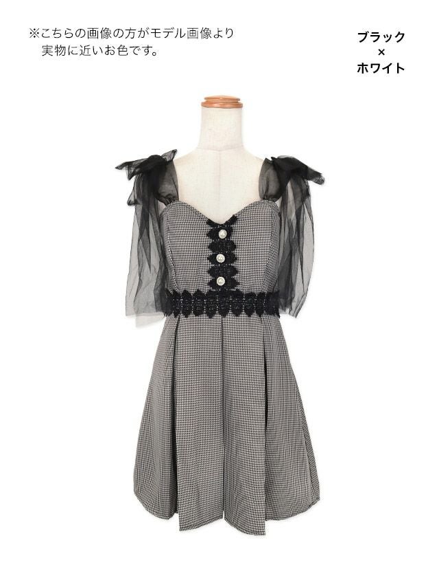 ショルダーチュールリボンキャミソール刺繍千鳥格子柄ボックスプリーツフレアミニドレスのイメージ画像1