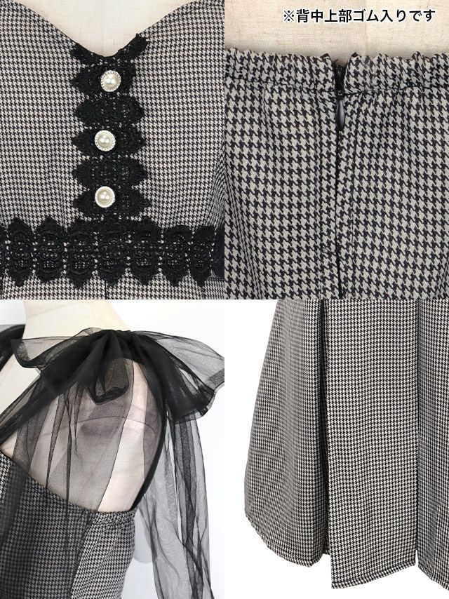 ショルダーチュールリボンキャミソール刺繍千鳥格子柄ボックスプリーツフレアミニドレスの商品詳細1