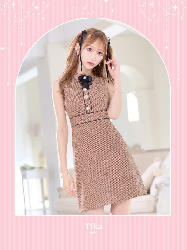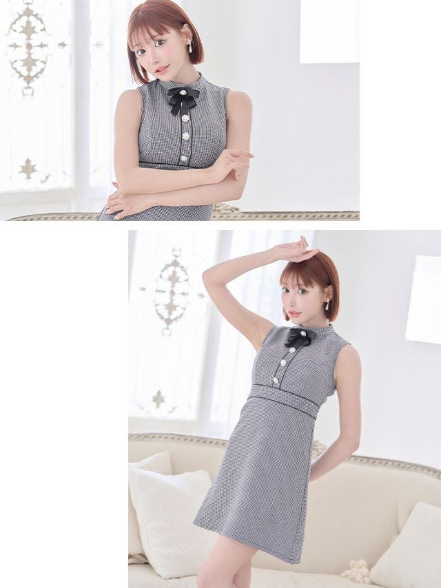 3. ネックリボン千鳥格子柄パールボタンパイピングノースリーブフレアミニドレス (Sサイズ~XXLサイズ) (明日花キララ/キャバドレス着用)