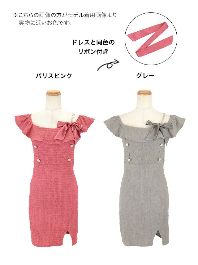 サテンリボン付きオフショルダー風アシメチェーンショルダーパールダブルボタンデザインワッフルスリットタイトミニドレスのカラーバリエーション