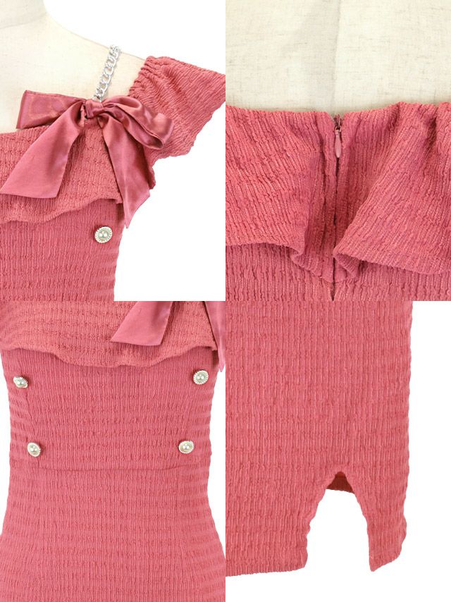 4. [SALE] サテンリボン付き オフショルダー風 アシメチェーンショルダー パールダブルボタン ワッフル タイトミニドレス (Sサイズ~XLサイズ) (雨宮由乙花/キャバドレス着用)