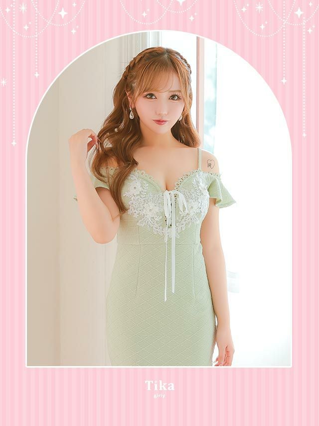 フェミニンな可愛さ全開♪ 肩出し 二の腕カバー バストカット レースアップ フラワー刺繍 ワッフル 裾フリル 谷間魅せ タイトミニドレス (Sサイズ~XLサイズ) (りせり/キャバドレス着用)