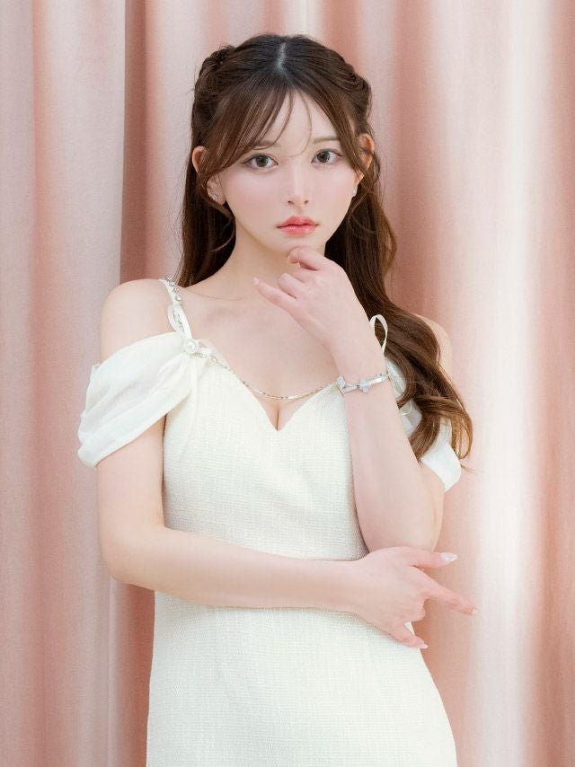 5. ミニドレス タイト 肩あき 谷間 リボン ビジュー チャーム付き ツイード 裾フリル アイボリー XL XXL キャバドレス (黒崎みさ着用) [tk-md266403]