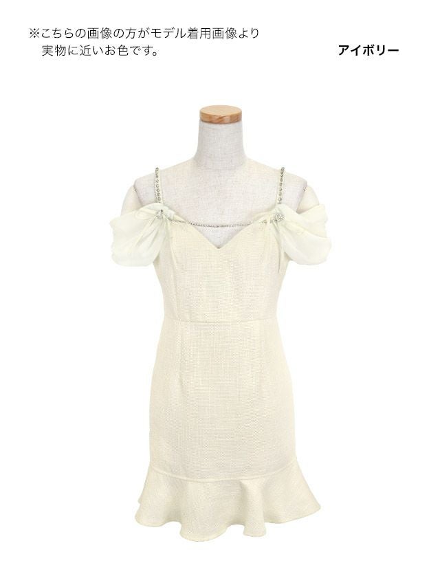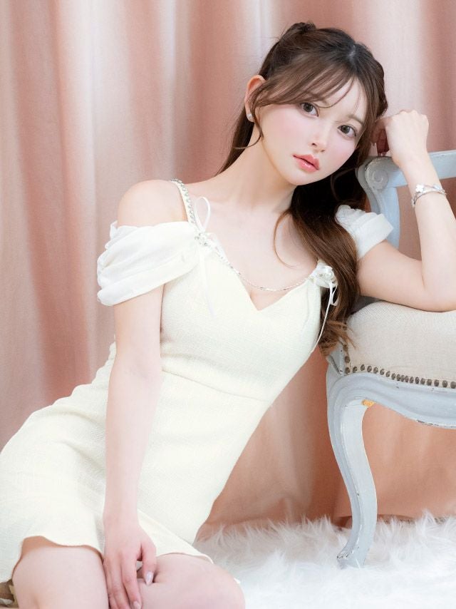 3. ミニドレス タイト 肩あき 谷間 リボン ビジュー チャーム付き ツイード 裾フリル アイボリー XL XXL キャバドレス (黒崎みさ着用) [tk-md266403]