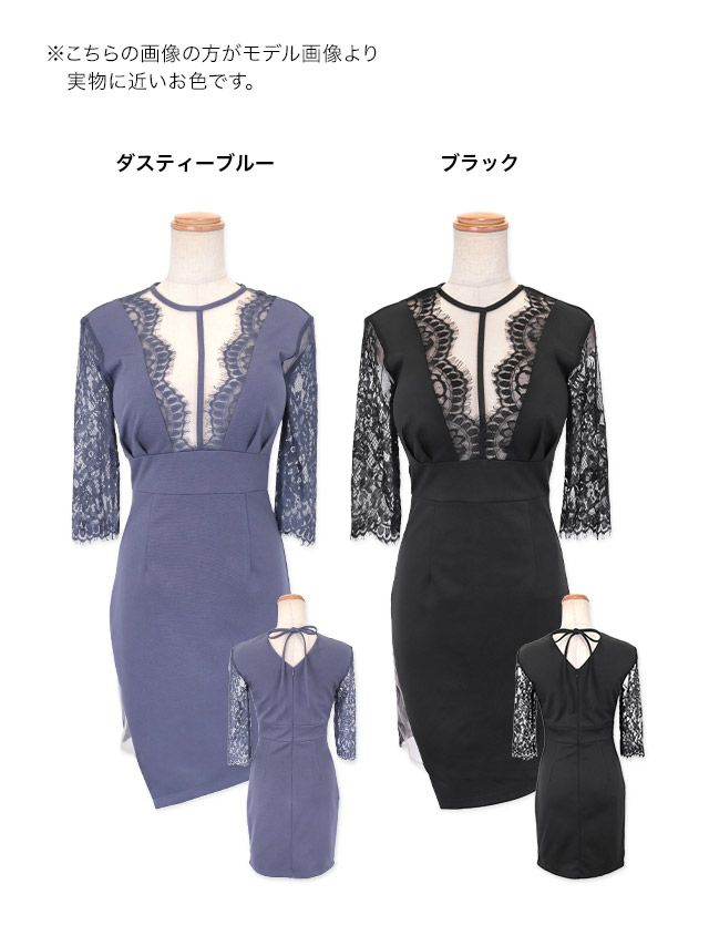 袖ありスカラップレースバストシアー切り替えアシメタイトミニドレスのカラーバリエーション