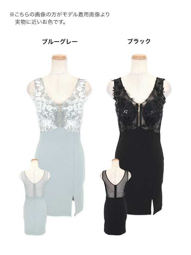 ノースリーブバストジップシアーフラワー刺繍切り替えスリットタイトミニドレスのカラーバリエーション