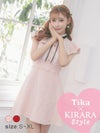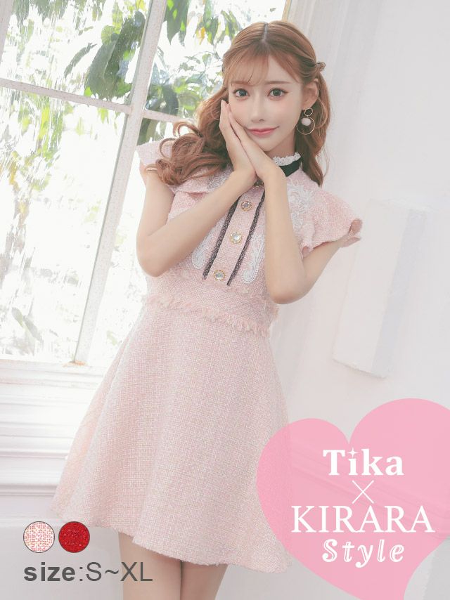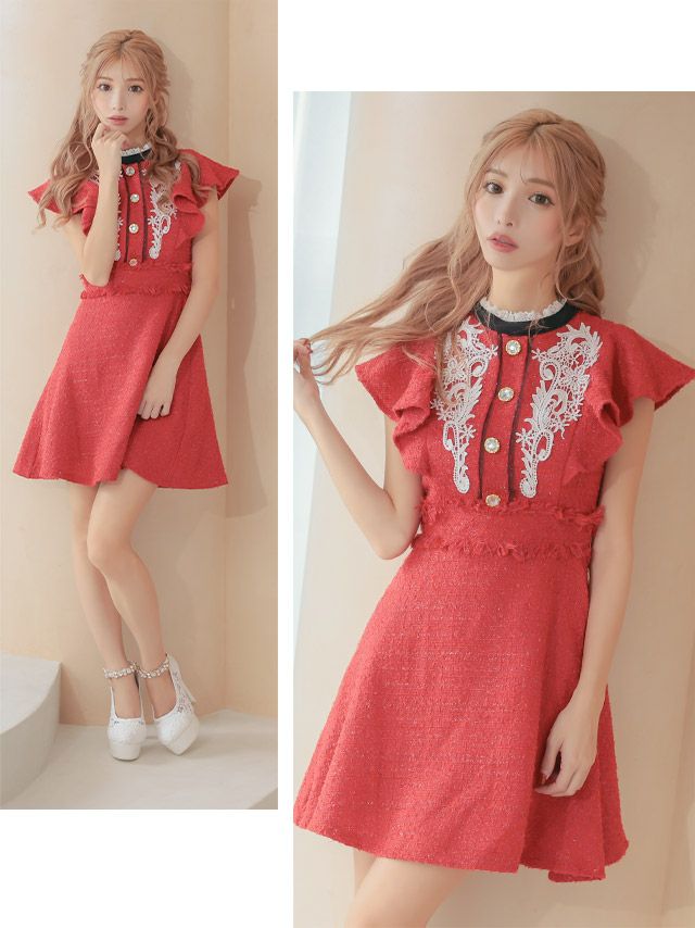 キャバドレス ミニ丈 Aライン 赤 大きいサイズ Tika ティカ スタンドネックフリル袖フラワー刺繍ツイードフレアミニドレス