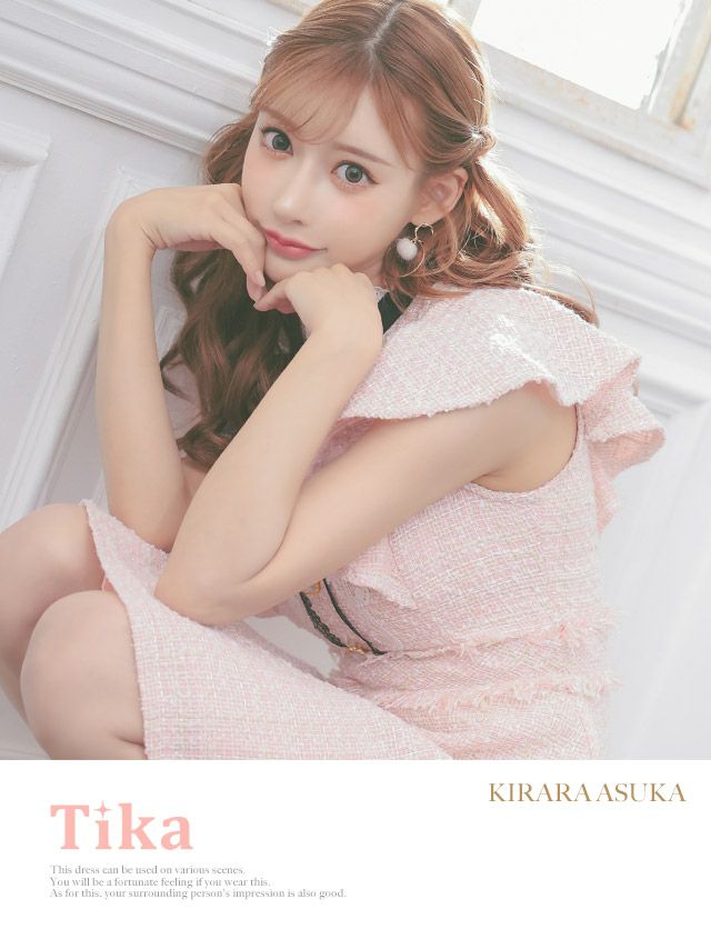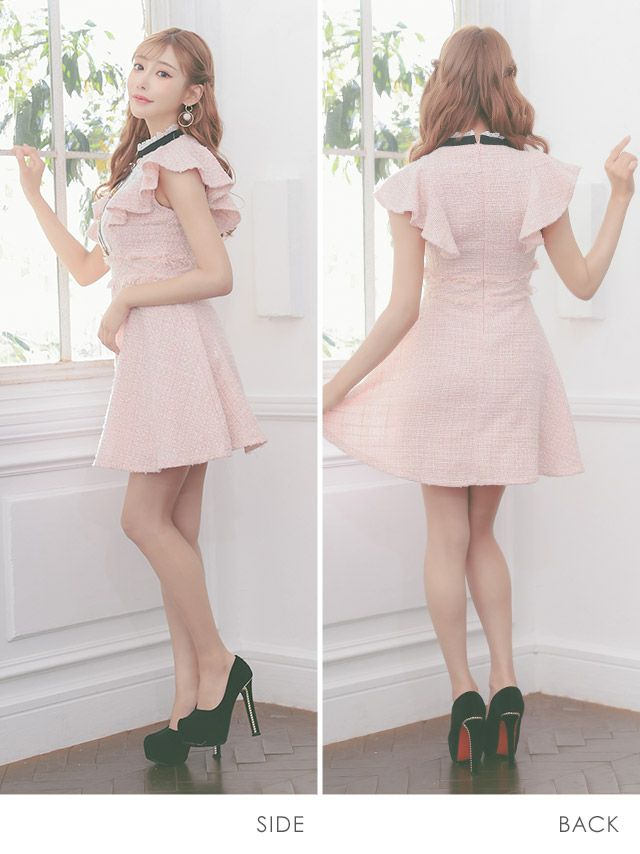そのまま同伴やアフターでも着れちゃう♪ スタンドネックフリル袖フラワー刺繍ツイードフレアミニドレス (Sサイズ~XLサイズ) (みゆう/キャバドレス着用)