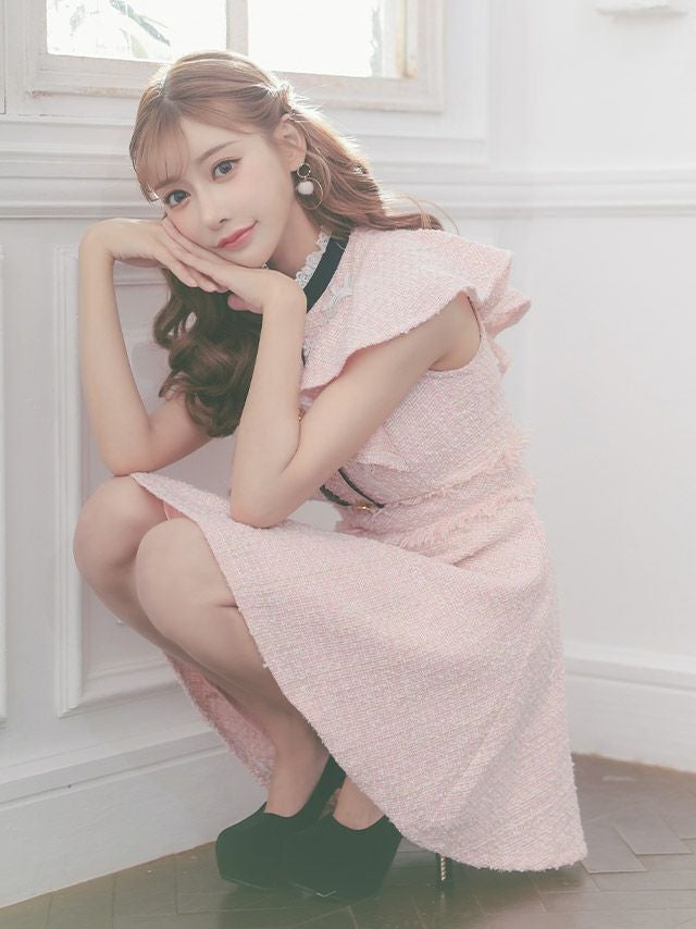 3. スタンドネックフリル袖フラワー刺繍ツイードフレアミニドレス (Sサイズ~XLサイズ) (みゆう/キャバドレス着用)