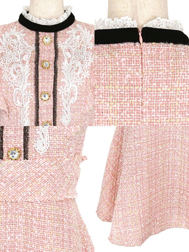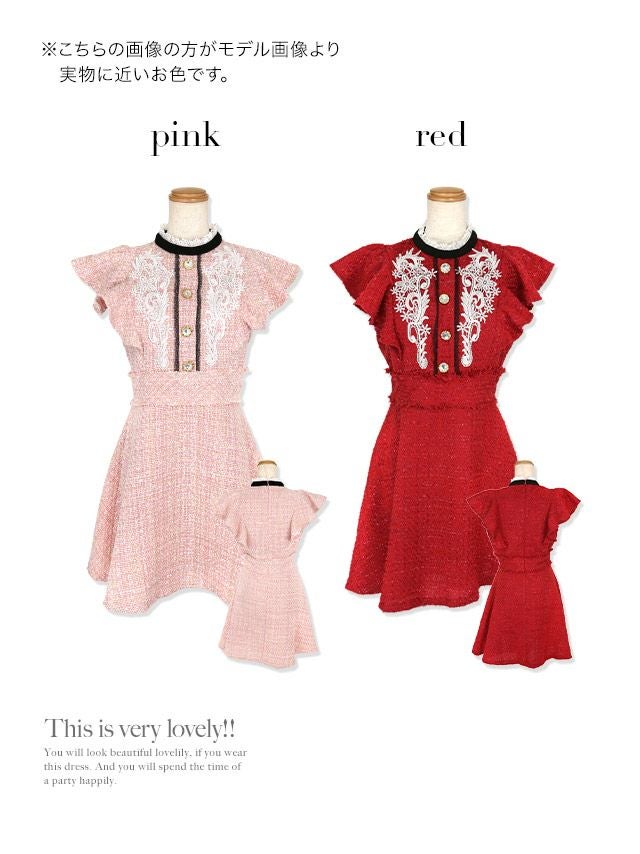 スタンドネックフリル袖フラワー刺繍ツイードフレアミニドレスのカラーバリエーション
