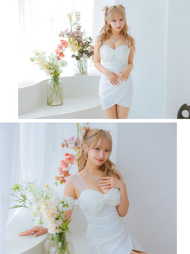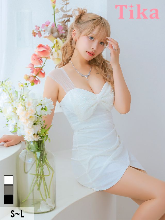 4. チュールキャミソールバストスパンコールビッグリボンギャザーラップタイトミニドレス (XSサイズ~Lサイズ) (せいせい/キャバドレス着用)