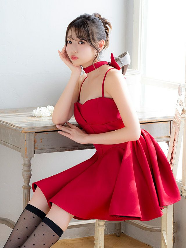 ボリューム感たっぷりなプリンセスシルエット♡ Aライン ミニドレス 谷間 シンプル キャミソール ネックリボン ワンカラー キャバドレス (雨宮由乙花着用)
