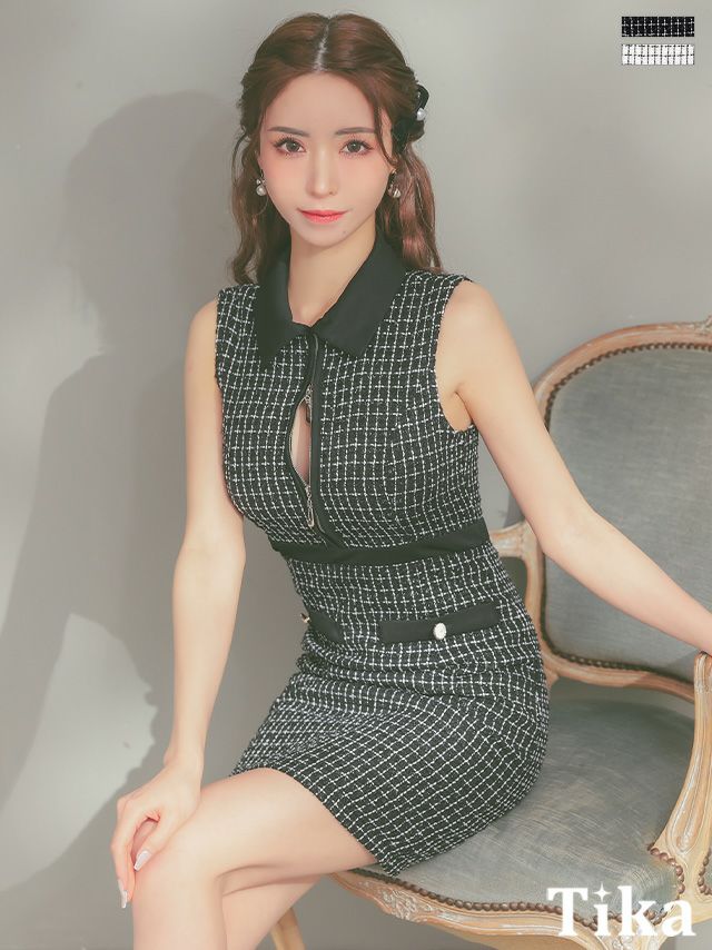3. 襟付き ノースリーブ ジップ ツイード チェック柄 タイトミニドレス (Sサイズ~XLサイズ) (浦西ひかる/キャバドレス着用)