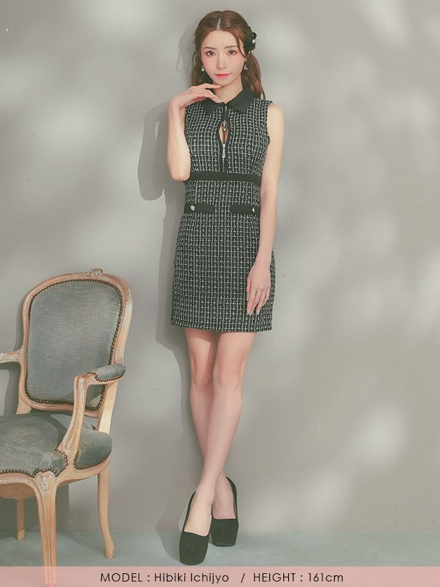 5. 襟付き ノースリーブ ジップ ツイード チェック柄 タイトミニドレス (Sサイズ~XLサイズ) (浦西ひかる/キャバドレス着用)