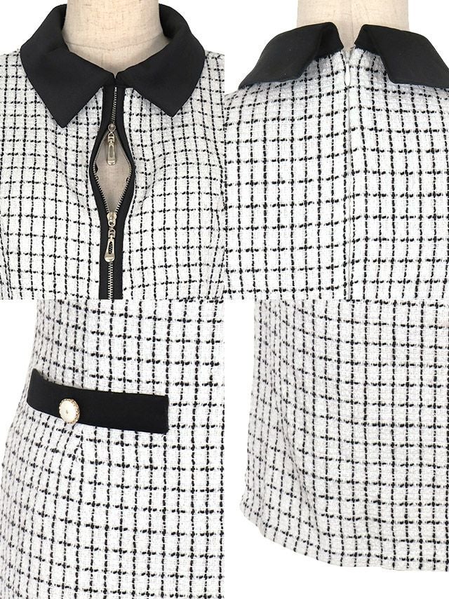 襟付きノースリーブジップデザインツイードチェック柄タイトミニドレスの商品詳細1