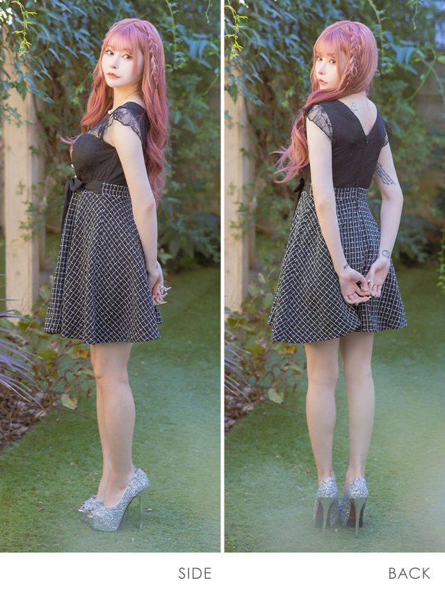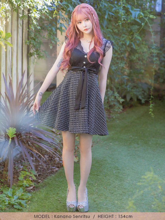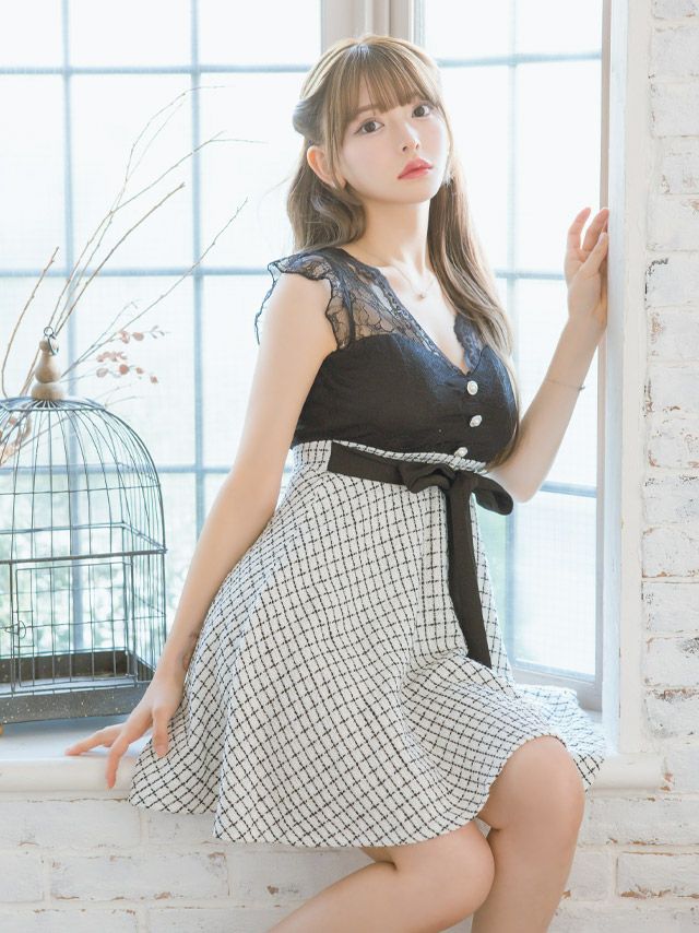 3. Vネックレースノースリーブウエストリボン切替ツイードガーリーチェック柄フレアミニドレス (Sサイズ~XLサイズ) (黒崎みさ/キャバドレス着用)