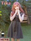 細部までこだわったガーリーな1着♪ Vネックレースノースリーブウエストリボン切替ツイードガーリーチェック柄フレアミニドレス (Sサイズ~XLサイズ) (黒崎みさ/キャバドレス着用)
