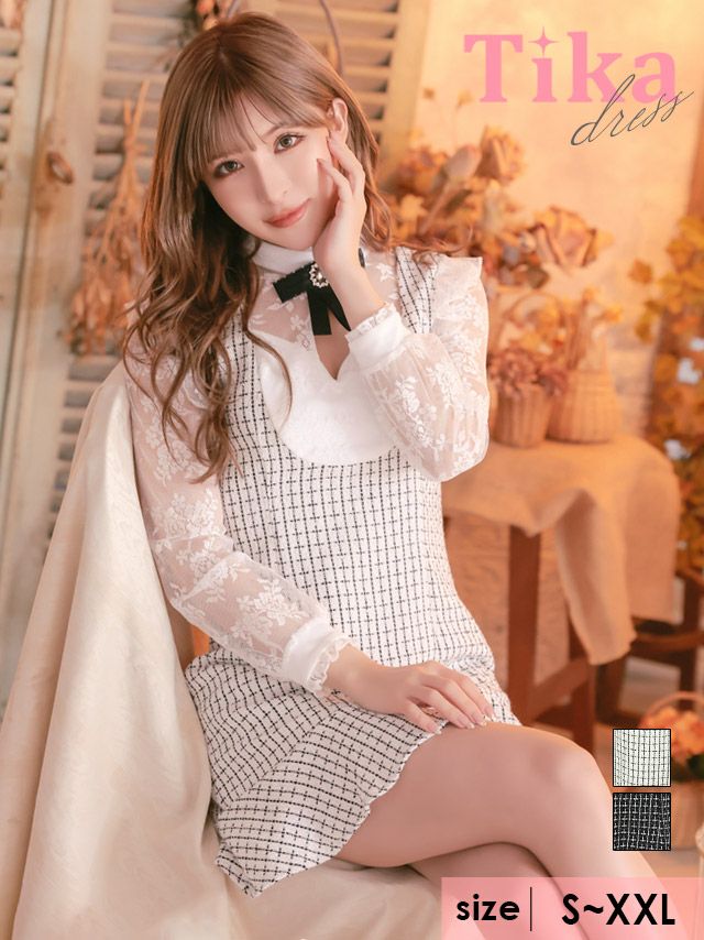 3. ブローチハートカットネックリボン長袖 袖ありツイードラメタイトミニドレス (Sサイズ~XXLサイズ) (ゆんころ/キャバドレス着用)