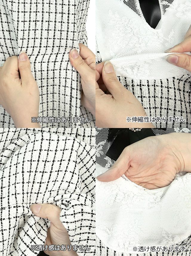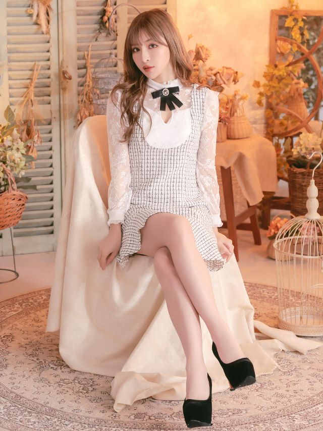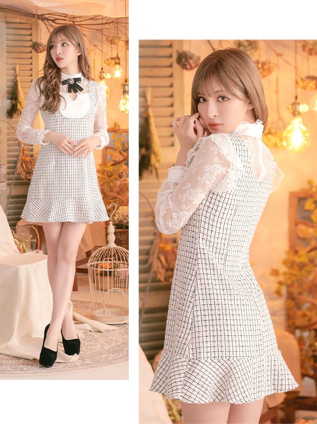 ネックリボンブローチハートカット長袖ツイードラメタイトミニドレスのカラーバリエーション