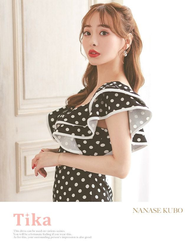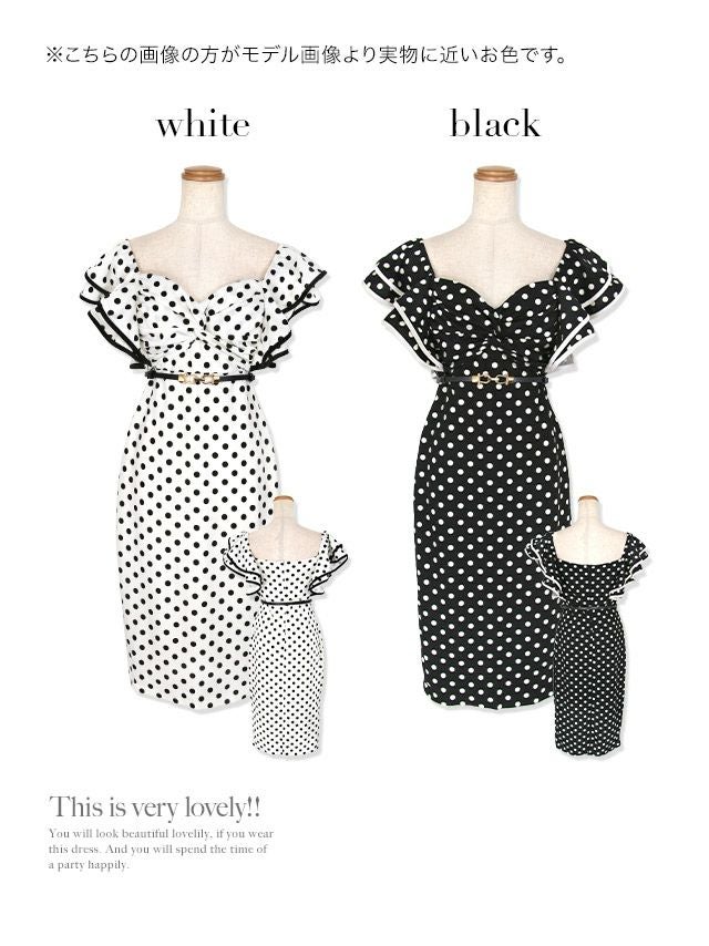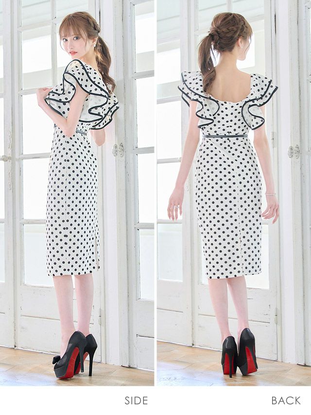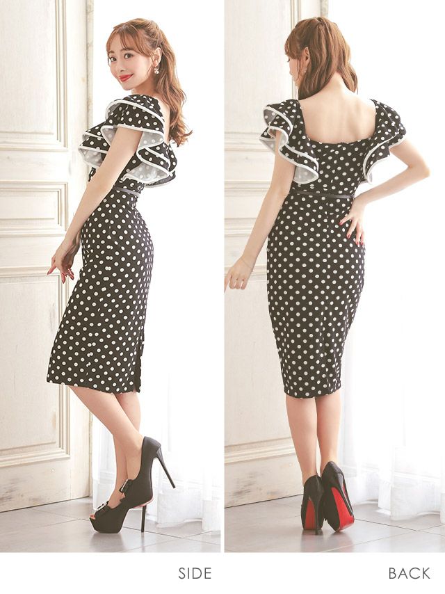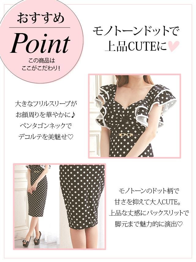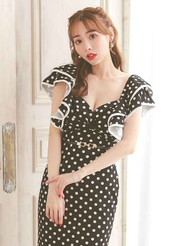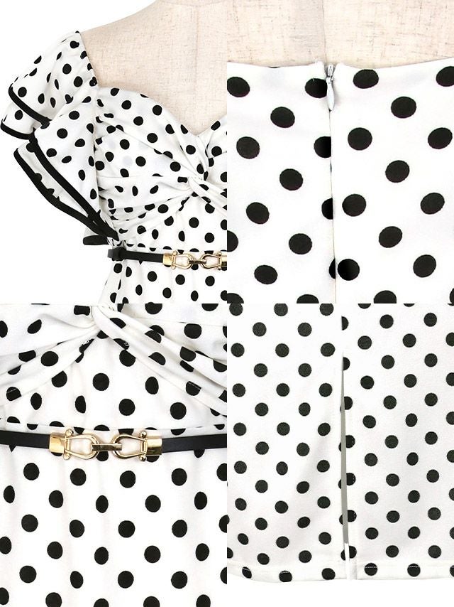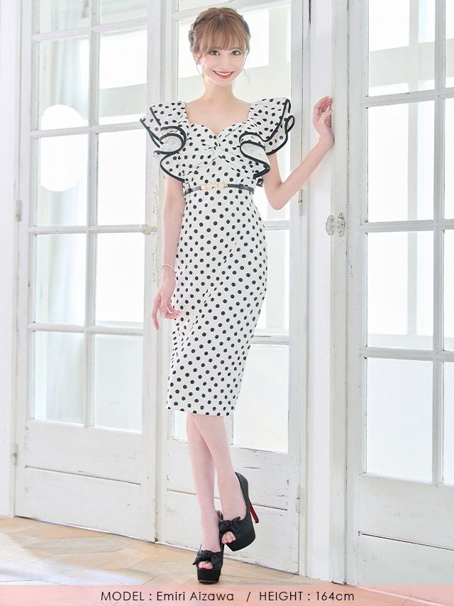 4. ウエストベルト付き ドット柄 半袖 フリル袖 タイト膝丈ドレス (Sサイズ~XLサイズ) (久保七瀬/キャバドレス着用)