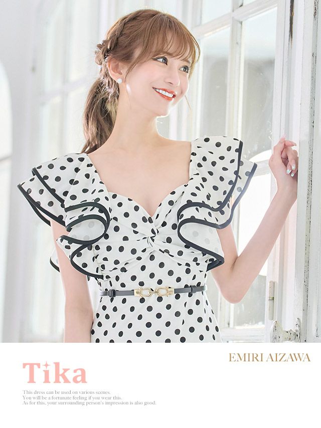 キャバドレス ミディアムドレス 袖あり 大きいサイズ ミディアム丈 キャバクラ Tika ティカ ウエストベルト付きドット柄半袖フリル袖膝丈タイトドレス