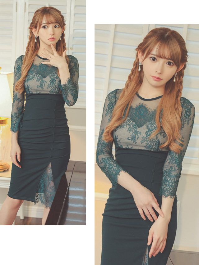 3. フラワーレース スリーブ 袖あり タイト膝丈ドレス (Sサイズ~XLサイズ) (黒崎みさ/キャバドレス着用)