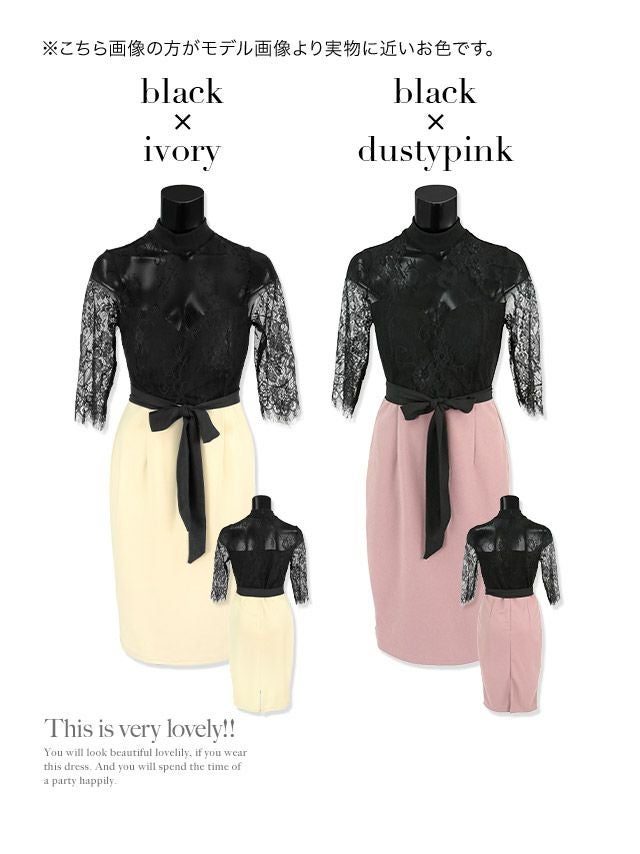 ハイネックブラックフラワーレースウエストリボンミディアムタイトドレスのカラーバリエーション