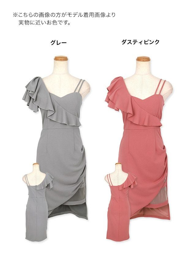 ワンショルダー風胸元フリルアシンメトリーシアー切り替え膝丈タイトドレスのカラーバリエーション
