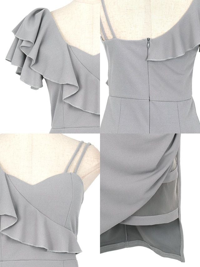 ワンショルダー風胸元フリルアシンメトリーシアー切り替え膝丈タイトドレスの商品詳細1