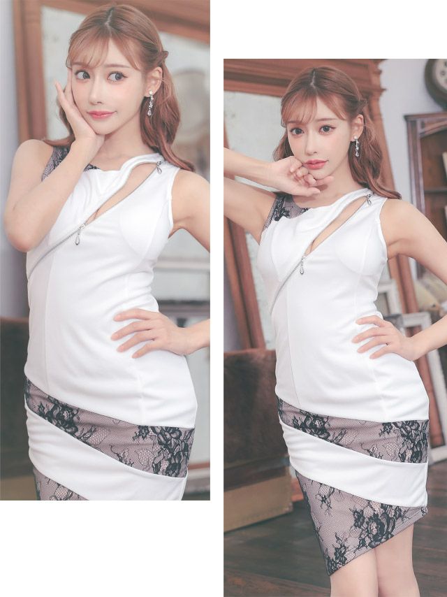 3. ノースリーブ バストジップ ヌーディーフラワーレース切り替え アシメタイト膝丈ドレス (Sサイズ~Lサイズ) (るな/キャバドレス着用)