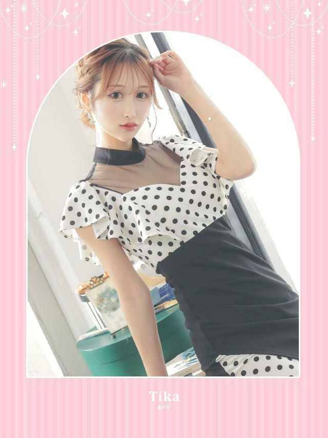 キャバドレス ミニ丈 大きいサイズ キャバクラ クラブ Tika ティカ ハイネックシアー半袖ドットフリル袖切り替えアシメタイトミニドレス