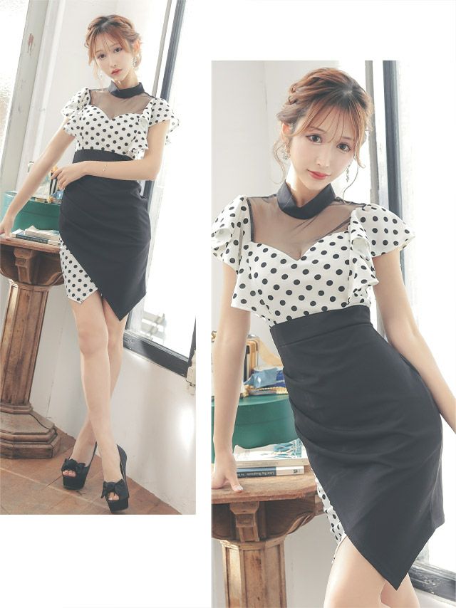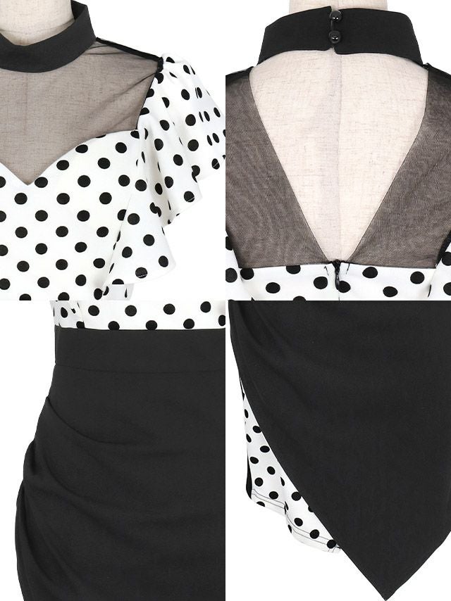 メリハリのある大人ガーリードレス♪ ハイネックシアー半袖ドットフリル袖切り替えアシメタイトミニドレス (Sサイズ~XLサイズ) (浦西ひかる/キャバドレス着用)