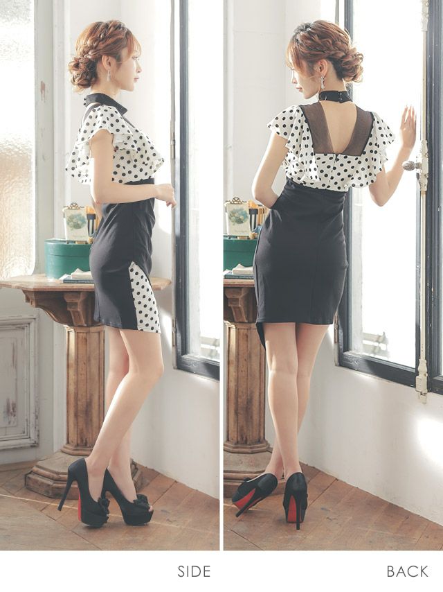 5. ハイネックシアー半袖ドットフリル袖切り替えアシメタイトミニドレス (Sサイズ~XLサイズ) (浦西ひかる/キャバドレス着用)