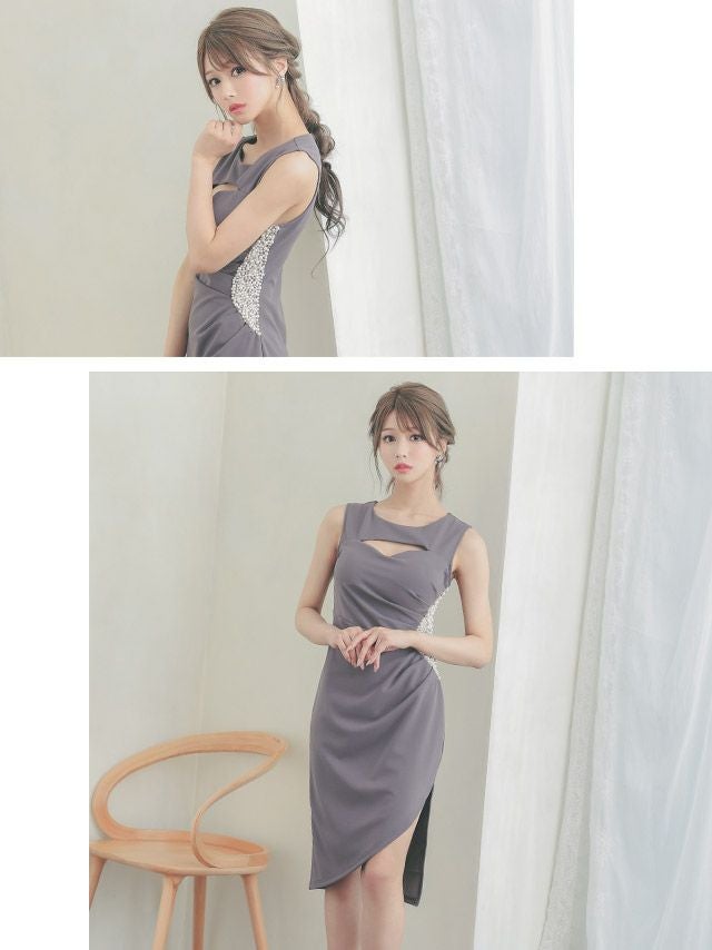 ワンカラーバストカットアウトサイドパールノースリーブ膝丈タイトドレスの商品詳細1
