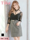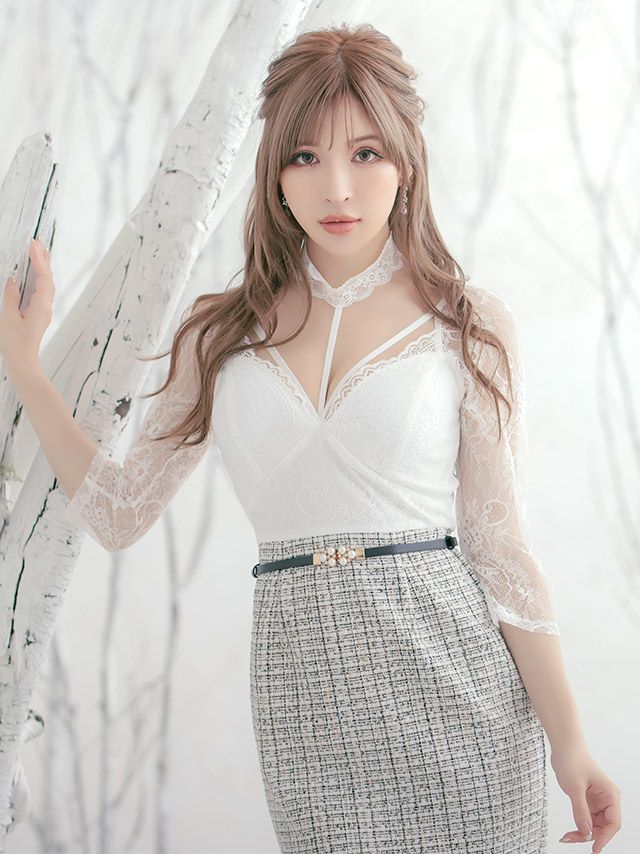 ツイードスカート袖ありチョーカーネックベルト付きくびれタイトミニドレス (Sサイズ~XLサイズ) (ゆんころ/キャバドレス着用)