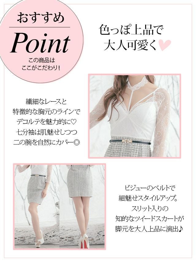 チョーカーネック袖ありツイードスカートベルト付きタイトミニドレスの商品特徴