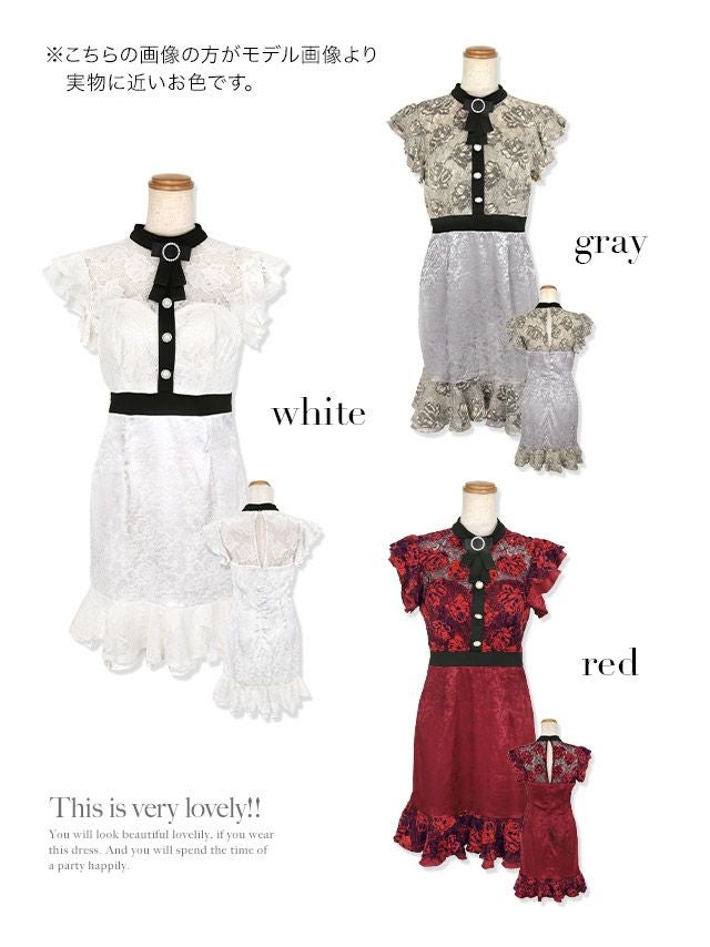フリル袖フラワーデザインリボンブローチ付きハイネックマーメイドノースリーブタイトミニドレスのカラーバリエーション