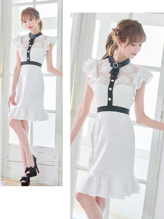 キャバドレス ドレス 綺麗 可愛い キュート フェミニン 大人 Tika ティカ フリル袖フラワーデザインリボンブローチ付きハイネックマーメイドノースリーブタイトミニドレス