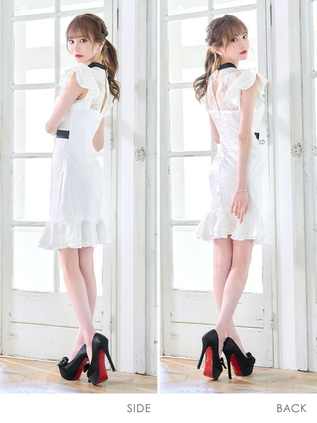 4. フリル袖フラワーデザインリボンブローチ付きハイネックマーメイドノースリーブタイトミニドレス (Sサイズ~XLサイズ) (明日花キララ/キャバドレス着用)