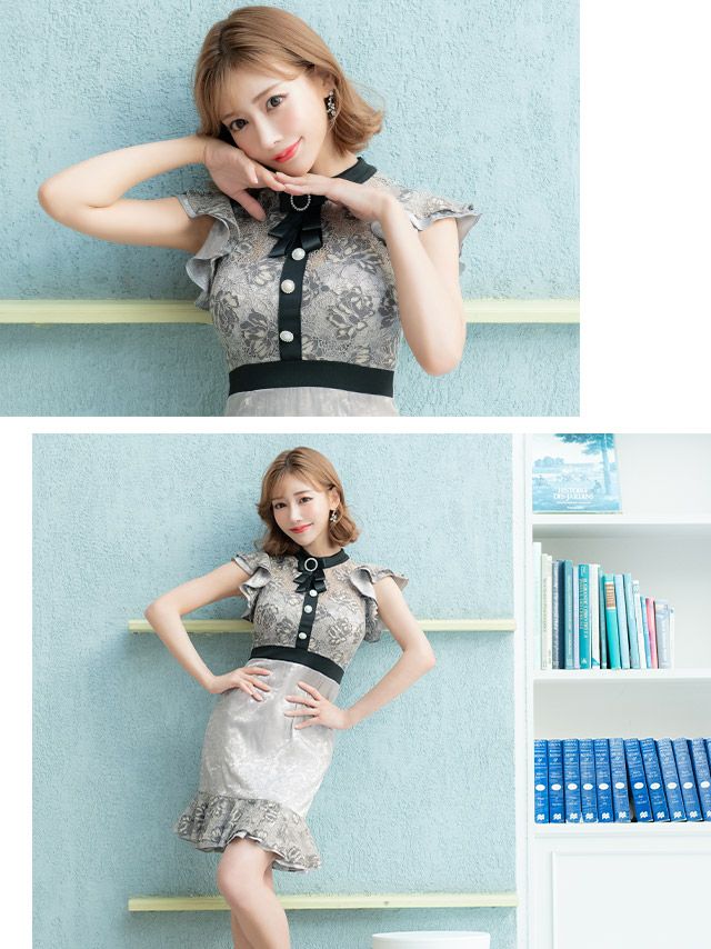 3. フリル袖フラワーデザインリボンブローチ付きハイネックマーメイドノースリーブタイトミニドレス (Sサイズ~XLサイズ) (明日花キララ/キャバドレス着用)