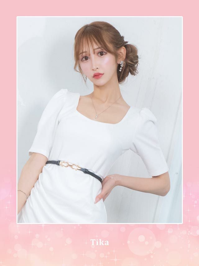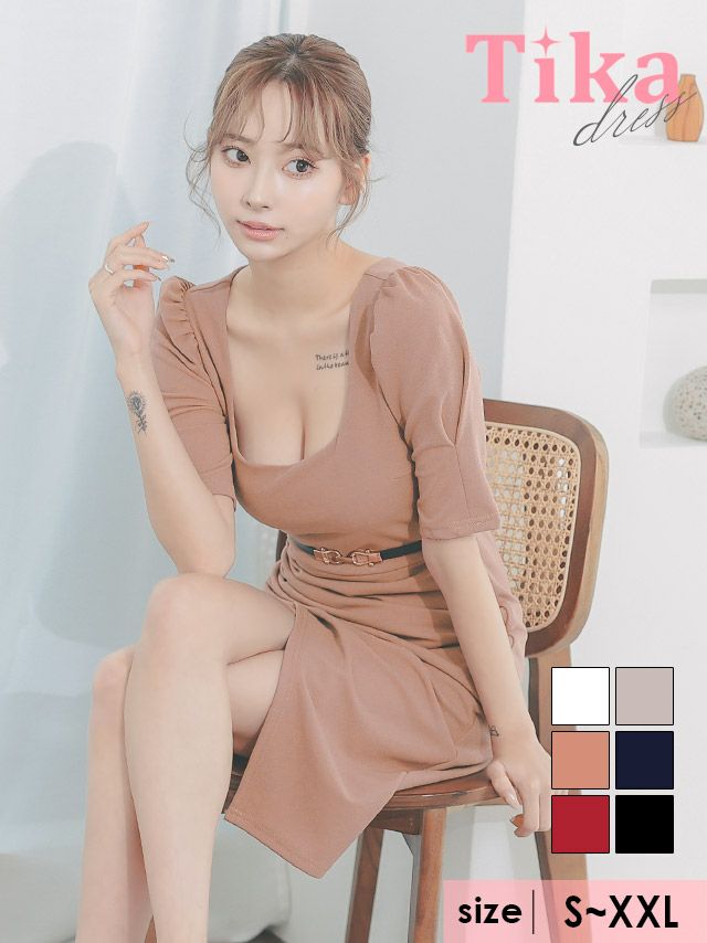キャバドレス ミディアム丈 ワンカラー 大きいサイズ Tika ティカ ベルト付き袖ありラップ膝丈タイトドレス