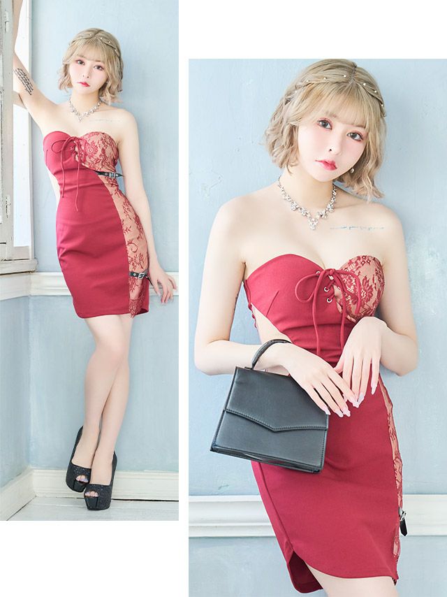 挑発的な美ボディを描く攻めドレス♪ ベアハートカットレースアップサイドレースベルトデザインくびれタイトミニドレス (Sサイズ~Lサイズ) (戦慄かなの/キャバドレス着用)