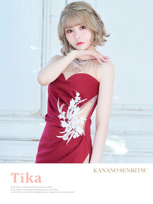 キャバドレス ミディアム丈 大きいサイズ Tika ティカ ノースリーブヌーディーチュールビジューバストカット切替サイドフラワー刺繍膝丈タイトドレス