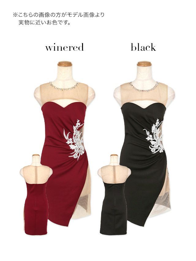 ノースリーブヌーディーチュールビジューバストカット切替サイドフラワー刺繍膝丈タイトドレスのカラーバリエーション