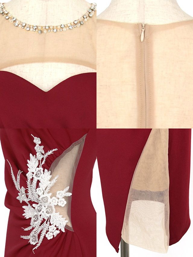 ノースリーブヌーディーチュールビジューバストカット切替サイドフラワー刺繍膝丈タイトドレスの商品詳細2