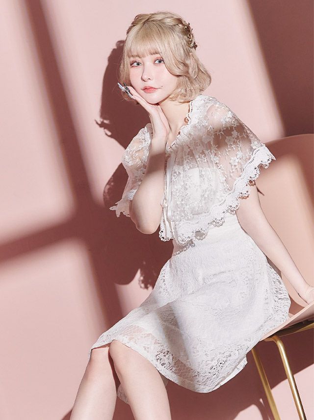 3. シアーフラワーケープ付きノースリーブウエストリボン総レースフレアミニドレス (Sサイズ~XLサイズ) (戦慄かなの/キャバドレス着用)